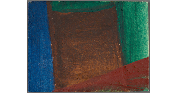 • A watercolor of abstract shapes in varying shades of blue with thick rust and blue lines vaguely outlining some of the shapes.