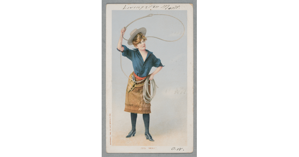 • A watercolor drawing of a White cowboy dancing in a saloon as another cowboy shoots at his feet, and several others watch from the bar.