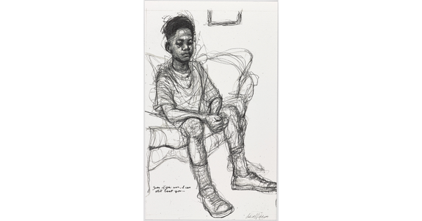 • A black-and-white photograph of a Black boy hunched over his knees on pavement, his hand on a book and face close to his hand.