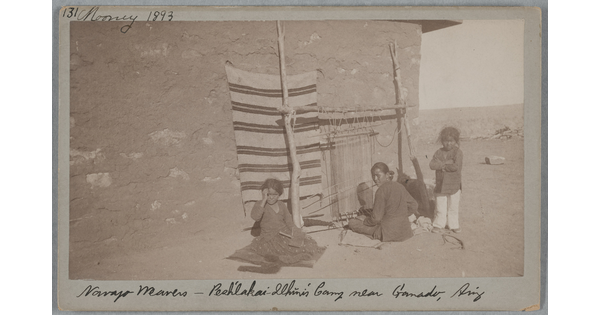www.cartermuseum.org/.../women-weaving-blanket-vertical-loom-girl-carding-wool-young-boy-nearby-all-native-dress