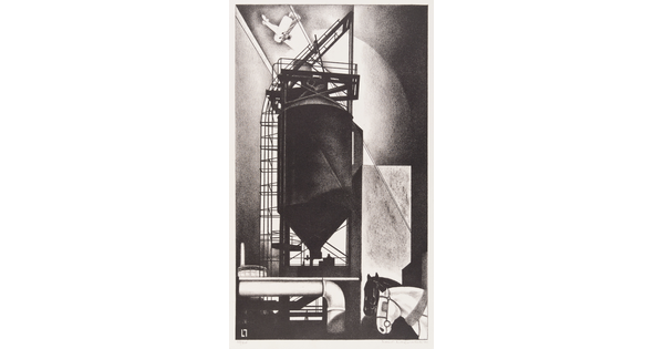 • A black-and-white print of an industrial scene with multiple train lines, bridges over a river, and smokestacks billowing smoke in the distance.