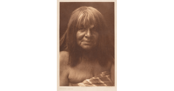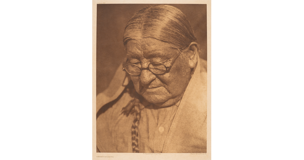 • A sepia-toned portrait photograph of an American Indian woman, a plaid shawl over most of her head and shoulders.