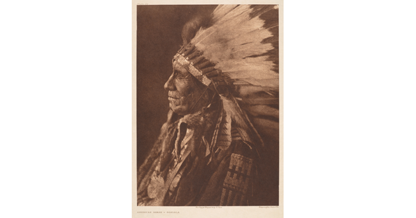 • A sepia-toned, close-up, photograph of an Indigenous man in profile wearing a traditional headdress.