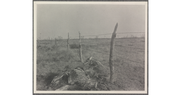 • [Coyote trapped at carcass of range critter, probably on the Three Circles Ranch, Texas]