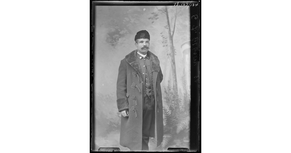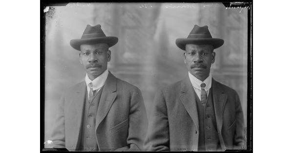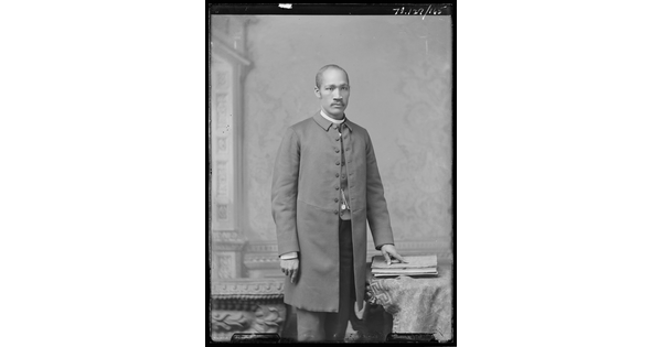 • A black-and-white image of a man standing in front of a sign that reads, "The Great Layton," and other performance props.