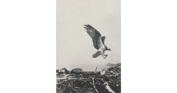• A black-and-white photograph a White woman, looking off to the side, with short dark hair wearing a long necklace and a long-sleeve top sitting in a floral, wingback chair.