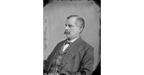 • A black-and-white portrait image of a seated White man with a long mustache and goatee wearing a bowtie and double-breasted jacket.