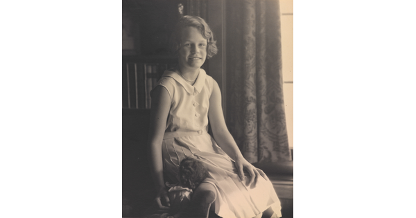 • A black-and-white photograph of a young White woman in profile from the neck up with her shoulder-length hair streaming behind her.