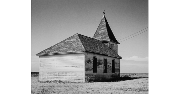 • A black-and-white photograph of a small, white clapboard church, viewed from the side, under clear skies.