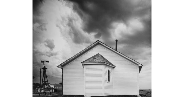 • A black-and-white photograph of a small, white clapboard church, viewed from the front, under dark clouds.