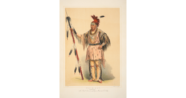 • A color print of an Indigenous woman with braids, beaded necklaces, earrings, and a red tunic.
