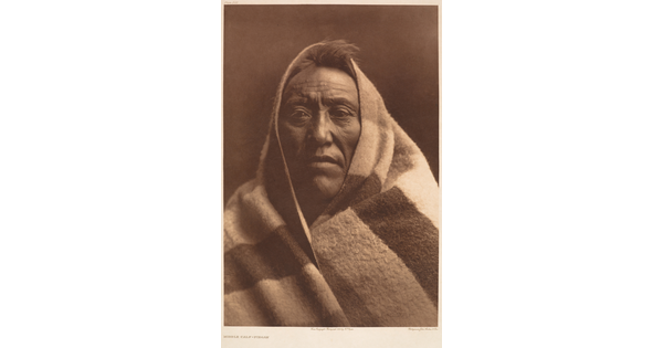 • A sepia-toned portrait photograph of a Native American man from the chest up in traditional dress, looking at the viewer.