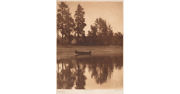 • A sepia-toned photograph of a Native American person sitting in a canoe on the water as another person stands on the rocky shore.