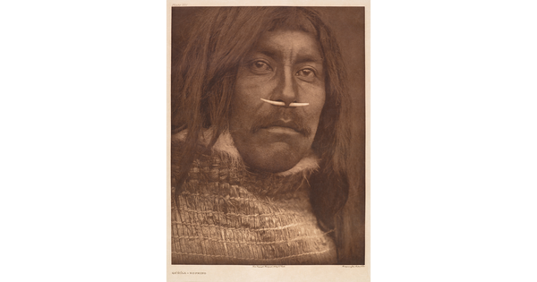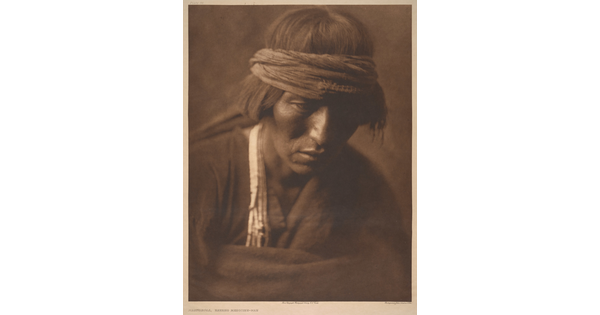 • A sepia-toned portrait photograph of an Indigenous man with medium-length hair and a cloth around his forehead and cloth wrapped over one shoulder and around his torso.