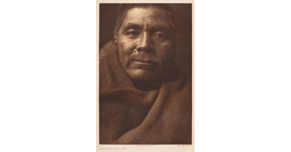 • A sepia-toned portrait photograph of an Indigenous man wrapped in a blanket and wearing a cloth wrap on his head.