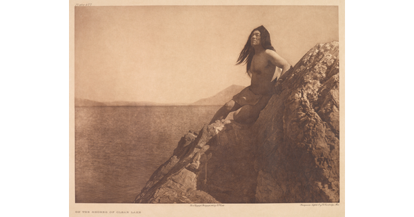• A sepia-toned photograph of an Indigenous man in traditional clothing and a feathered headdress sitting on a rock high above a lake at the base of mountains.