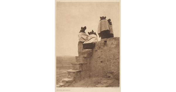 • A color print of an Indigenous woman with long hair, a blue blanket or shawl wrapped over a red and gray dress, a child on a cradleboard slung on her back.