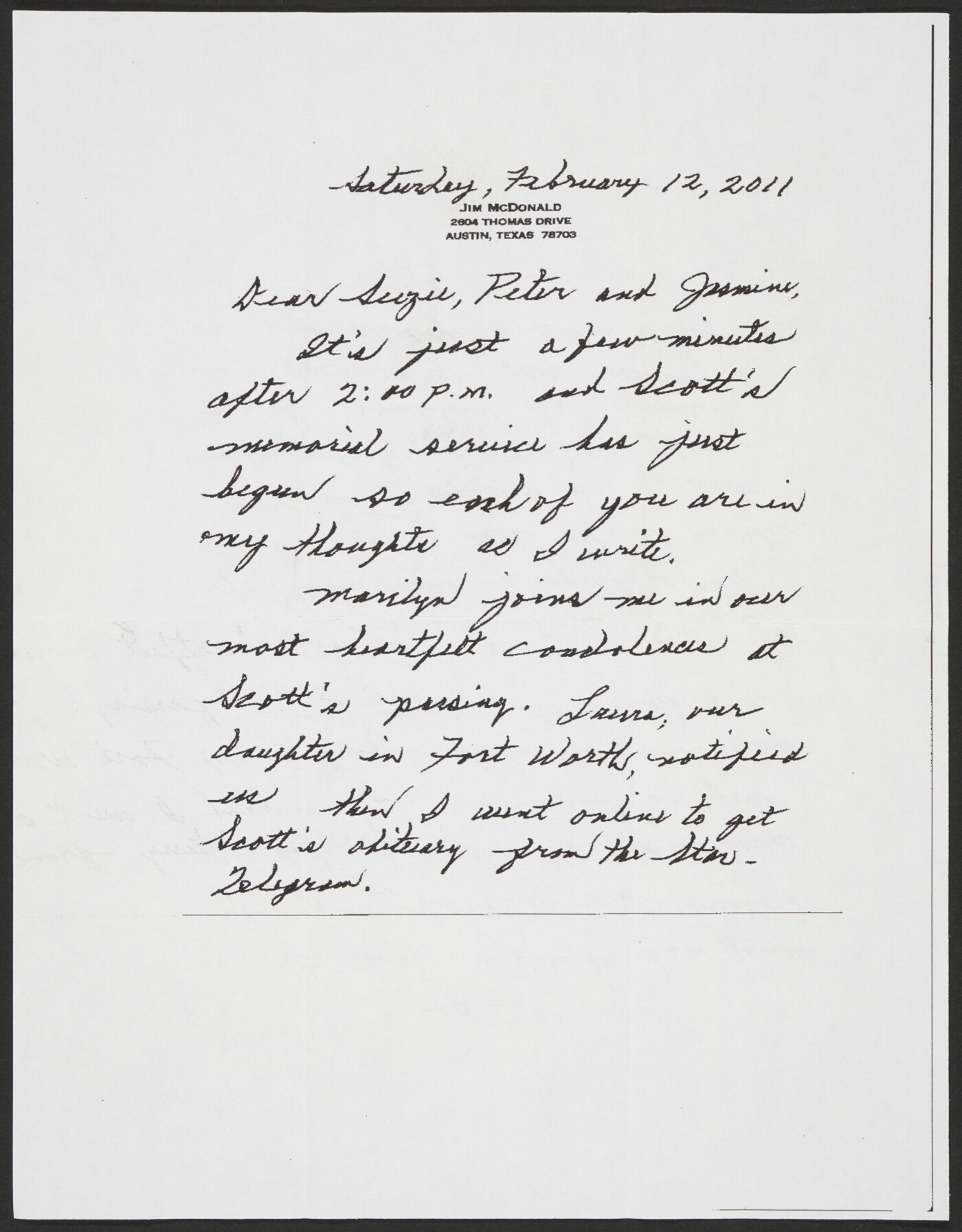 • Marilyn and Jim McDonald, Austin, Texas, to Suzie, Peter, and Jasmine Gentling. February 12, 2011.