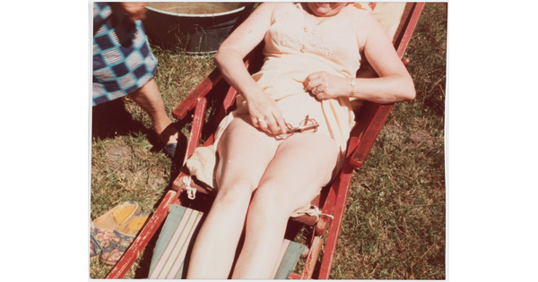 • [Woman in Lawn Lounge Chair Lifting Yellow Skirt]