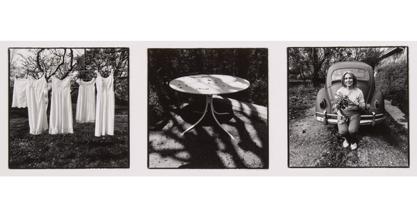 • [Women's lingerie hanging on clothes line; b: patio table; c: woman holding clippers and flowers sitting on rear bumper of Volkswagen]