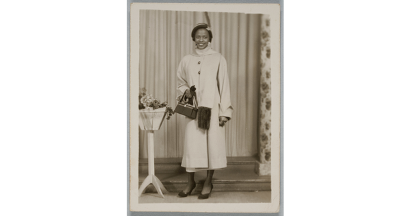 • A black-and-white studio photograph of the head and shoulders of a Black woman in a graduation cap and gown.