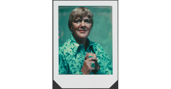 • A black-and-white photograph a White woman with short dark hair wearing a long necklace and a long-sleeve top sitting in a floral, wingback chair.