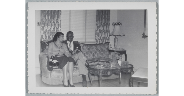 • A black-and-white image of a White woman wearing a large sunhat holding a child on her lap, both wearing white.