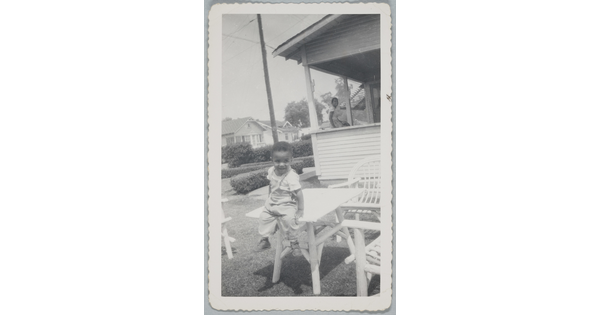 • A color school photograph of a Black child with short hair wearing a white and red turtleneck.