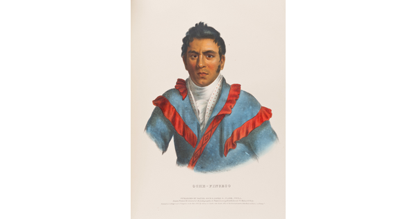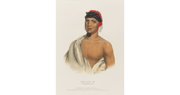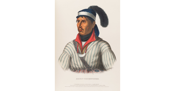 • A color print of an Indigenous man dressed in a tunic, full-length headdress, and holding a feathered spear.