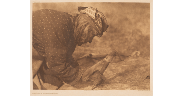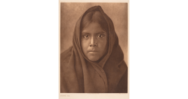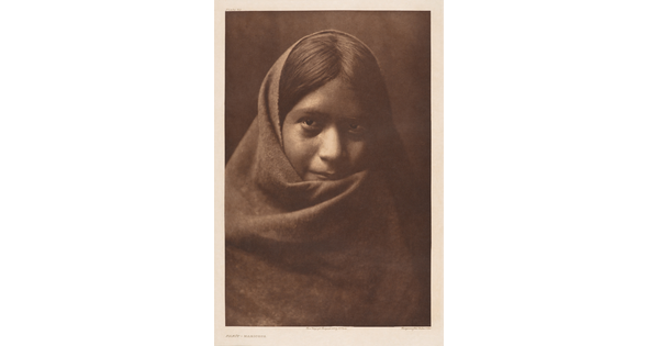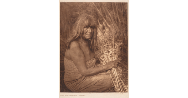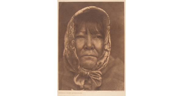 • A sepia-toned photograph of an elderly Indigenous person with hair pulled back and a blanket around their shoulders.
