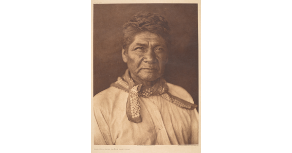 • A sepia-toned portrait photograph of an older Indigenous person wearing a headband, and a solid-colored cloth wrapped around their shoulders and under their face.