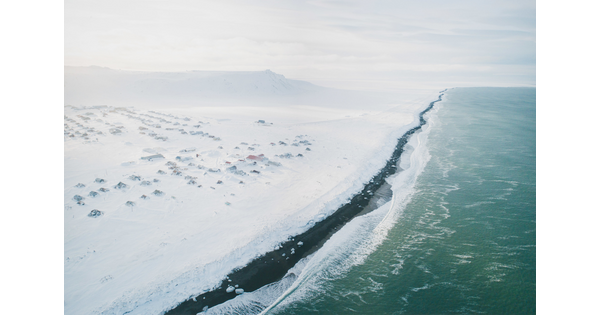 • A color photograph of a group of people crossing a vast, snowy landscape.