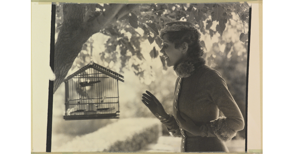 • A sepia-toned advertisement poster for Kodak of a White woman in profile holding a large camera and looking down into the viewfinder.
