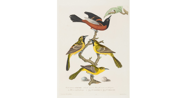 • Oriolus Spurius, Orchard Oriole, Female, and Males of the Second and Third Years, Male in Complete Plumage, Egg of the Orchard Oriole, Egg of the Baltimore Oriole