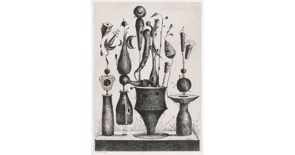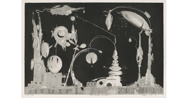 • A black-and-white print of abstract, bird-like figures and balloons over a steampunk-style city skyline.