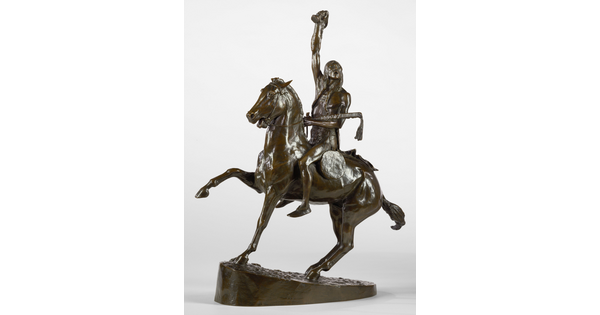 • A bronze sculpture of an Indigenous person crouched on a running horse holding a spear and a whip.