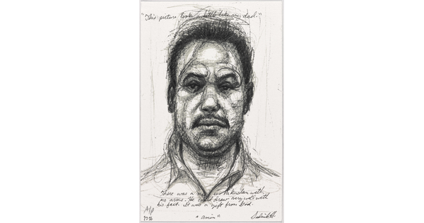 • A black-and-white print of a sketch of a Black man with a beard and glasses, wearing a cowboy hat.