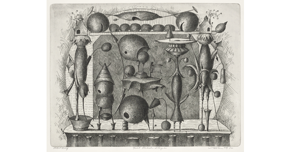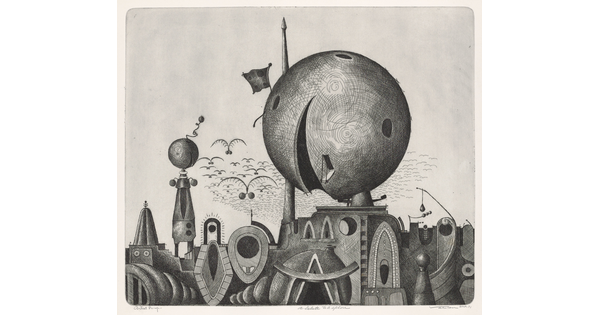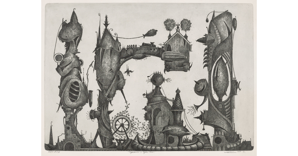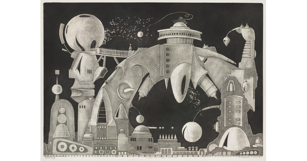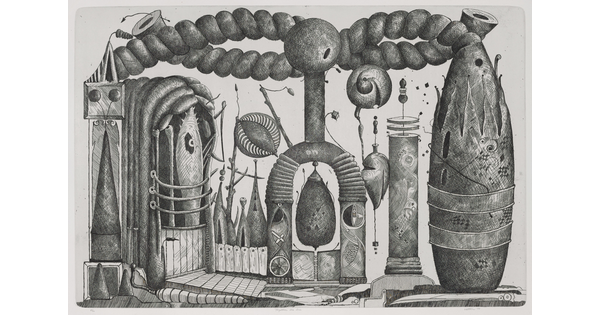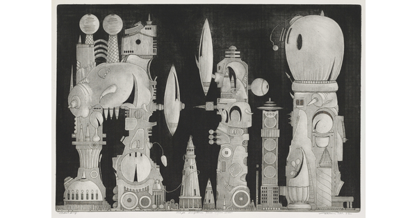 • An abstract black-and-white print of machine-like creations layered and lined up next to each other.