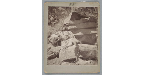 • A sepia-toned photograph of a group of mostly seated Indigenous figures and two on horseback.
