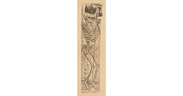 • A black-and-white print of a skeleton carrying a baby skeleton on its back in a sling and holding a chicken by its wings.