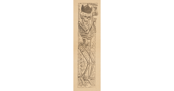 • A black-and-white print of a skeleton wearing a sombrero standing among a pile of human skulls.