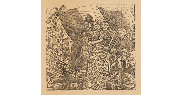 • A sepia-toned print of a Christ figure draped in robes that reveal the Sacred Heart and surrounded by cherubs.
