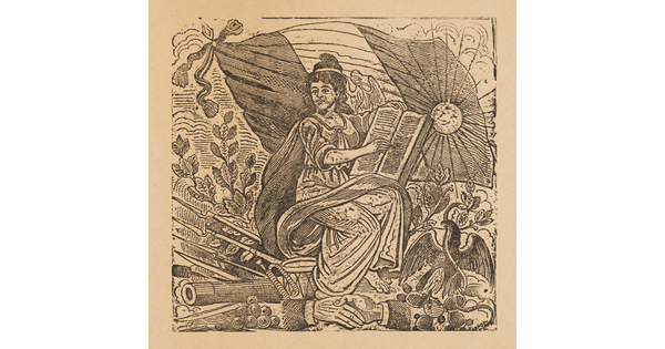 • A black-and-white print illustration of two children and a woman holding on to a man surrounded by soldiers.