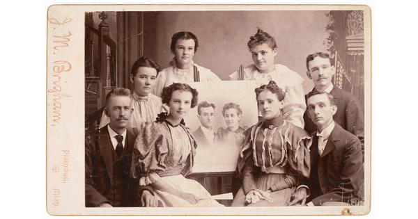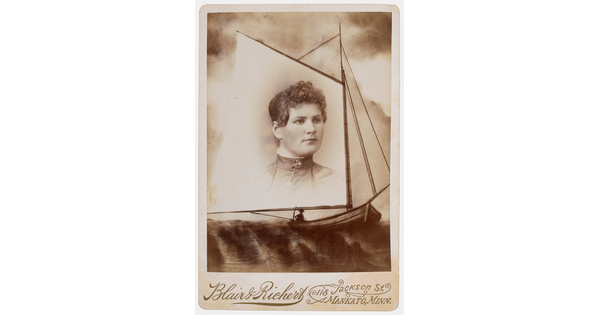 • A sepia-toned studio photograph in which the head and shoulders of a White woman seems to be popping out of an envelope.