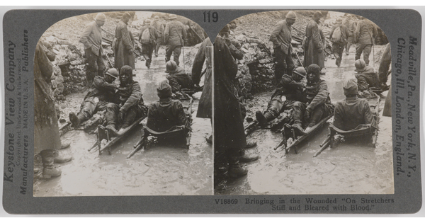 • Bringing In the Wounded "On Stretchers Stiff and Bleared with Blood."