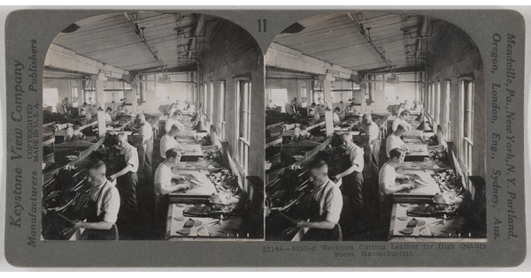 • Skilled Workmen Cutting Leather for High Quality Shoes, Massachusetts