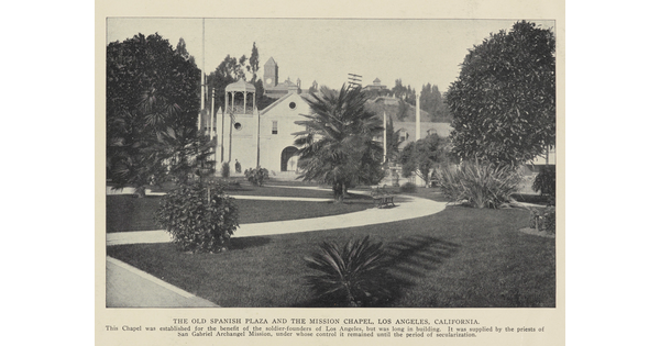 • The Old Spanish Plaza and the Mission Chapel, Los Angeles, California.