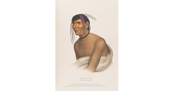 • A color print of an Indigenous man in profile with a strip of bright red hair, dark braids, earring, and fur shawl.