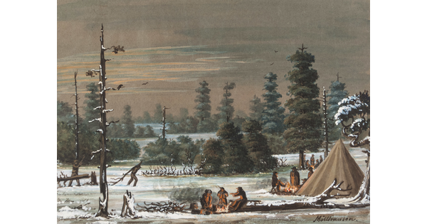 • A color print of an Indigenous man with feathers in his hair, draped in a fringed animal skin blanket over beaded leggings and moccasins.