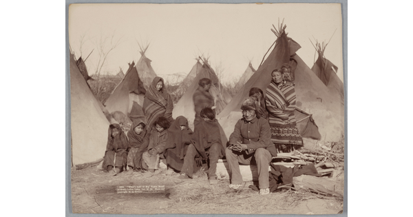 • A slightly faded sepia-toned photograph of a group of Indigenous adults and children and one White child standing in front of a camp.